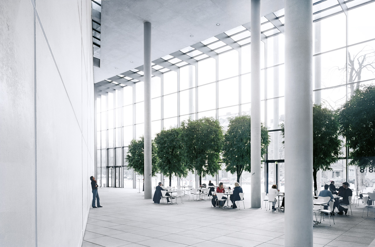 These columns feature concurrent high load bearing capacity and slender cross sections, resulting in a transparent and light appearance while providing significant structural support. Thanks to the spun concrete technology, the use of space can be conceptualized flexibly, multifunctionally and independent of the structure of the building.