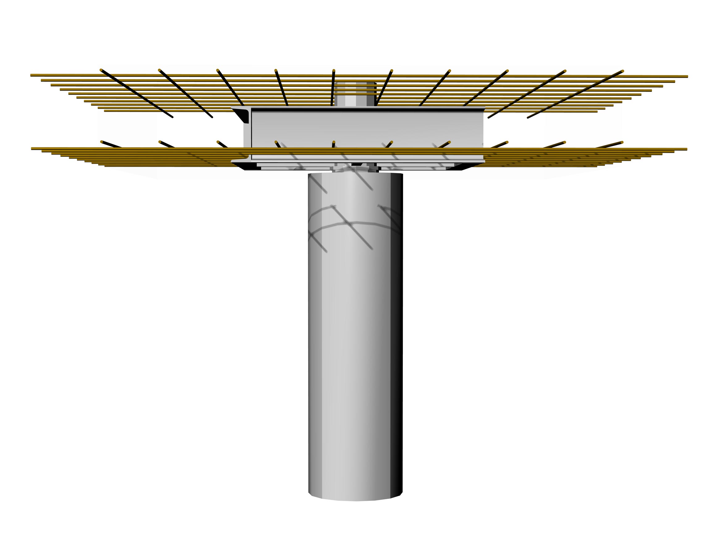 The Europilz® was developed for use with Geilinger-Stütze®, in order to dissociate punching problems from column diameters. This was solved so perfectly that the Europilz® can be combined with any kind of column today, whether composite column, steel column, concrete column, or spun concrete column.